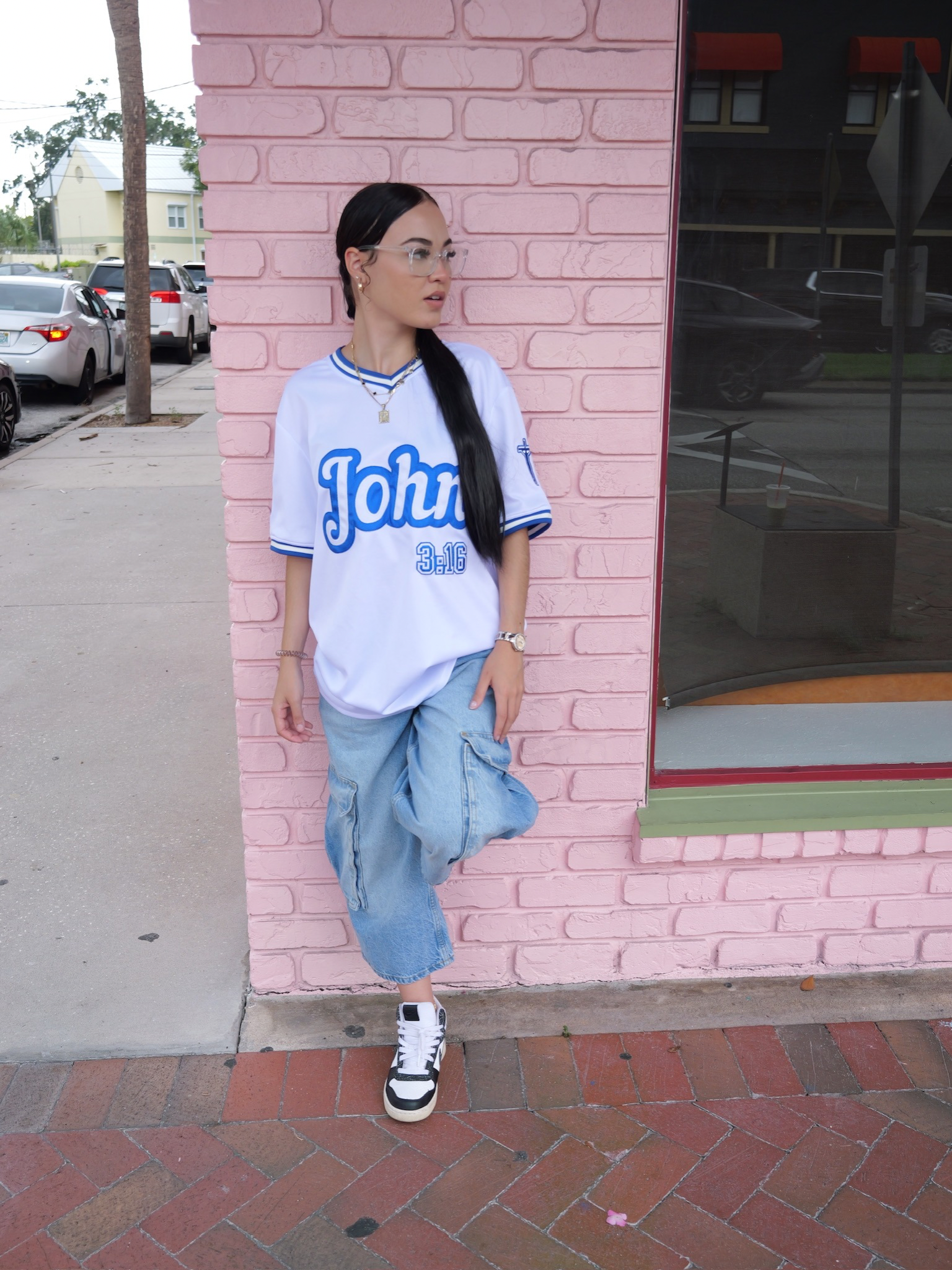 The Blue John 3:16 Jersey is a high-quality baseball jersey that represents Jesus Christ's ultimate sacrifice for our salvation. Made with expert embroidery, it offers a unisex/men sizing for a comfortable fit. Wear it with pride and show your faith in style.